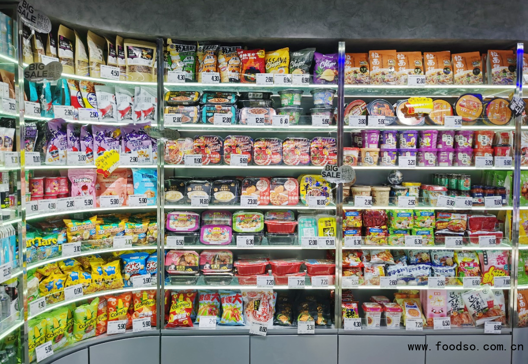 從品類上來講,店內(nèi)產(chǎn)品以食品為主,小范圍的日化產(chǎn)品被堆放在門口引流。而在食品貨架上,海底撈、嗨吃家、元?dú)馍值瘸R娖放普急容^小,與商超、便利店等線下渠道相比,價格有明顯優(yōu)勢,比如元?dú)馍謿馀菟科吭?元左右,這些產(chǎn)品跟日化共同承擔(dān)引流的功能。