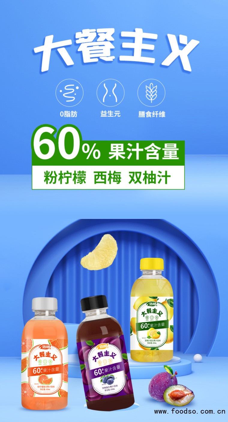 多元口味。為了滿足消費(fèi)者尤其是年輕“多變”而“挑剔”的口味需求,浩明大餐主義構(gòu)建起豐富的產(chǎn)品構(gòu)建,推出了浩明大餐主義粉檸檬復(fù)合果汁、西梅膳食纖維果汁飲料、雙柚汁復(fù)合果汁飲料等三種口味