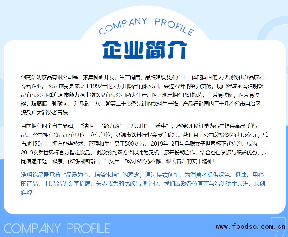公司前身是成立于1992年的天壇山飲品有限公司。經(jīng)過(guò)27年的努力拼搏,現(xiàn)已建成河南浩明飲品有限公司和濟(jì)源市能力源生物飲品有限公司兩大生產(chǎn)廠區(qū),現(xiàn)已擁有PET瓶裝,三片易拉罐,兩片易拉罐,玻璃瓶,乳酸菌,利樂(lè)磚,八寶粥等二十多條先進(jìn)的飲料生產(chǎn)線,產(chǎn)品行銷國(guó)內(nèi)三十幾個(gè)省市自治區(qū),深受廣大消費(fèi)者青睞。目前擁有四個(gè)自主品牌,“浩明”“能力源”“天壇山”“沃牛”,同時(shí)為客戶提供私人訂制服務(wù),并承接OEM訂單為客戶提供高品質(zhì)的產(chǎn)品。公司擁有食品示范單位,立信單位,濟(jì)源市飲料行業(yè)會(huì)員等稱號(hào)。截止目前公司總投資超過(guò)1.5億元,總占地150畝,擁有各類技術(shù)、管理和生產(chǎn)員工500多名。2019年12月與乒聯(lián)女子世界杯正式簽約,成為2019女乒世界杯官方指定飲品。此次簽約雙方將以此為契機(jī),展開(kāi)長(zhǎng)期合作,結(jié)合各自資源與渠道優(yōu)勢(shì),共同傳遞年輕、健康、化的品牌精神,與女乒一起發(fā)揚(yáng)堅(jiān)持不懈、艱苦奮斗的實(shí)干精神!
